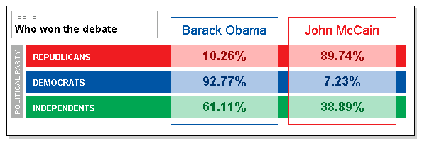 According to the MediaCurves poll about the first presidential debate last night, Republicans overwhelmingly saw a McCain smackdown, while Democrats overwhelmingly saw Obama as the clear winner.
