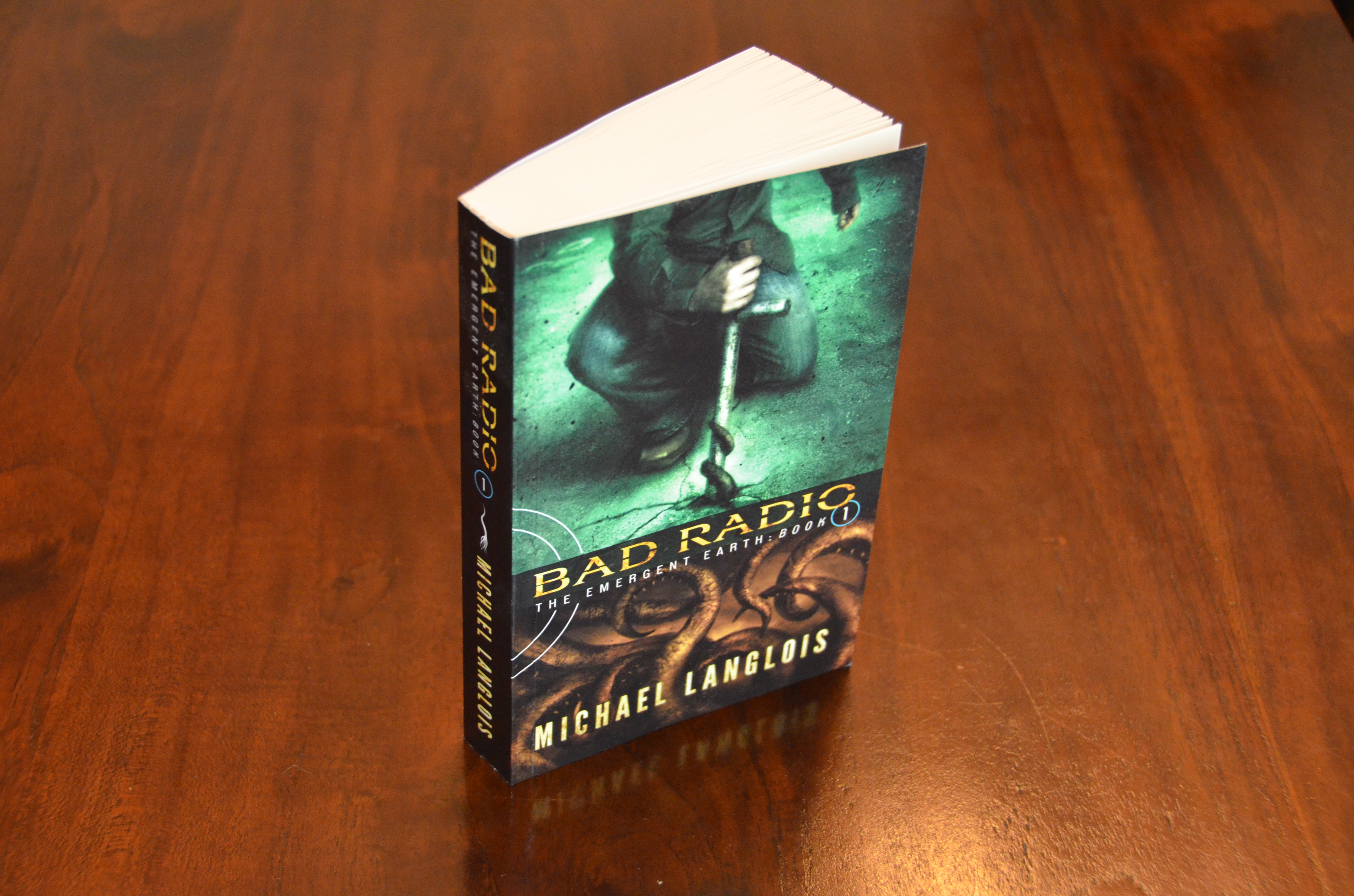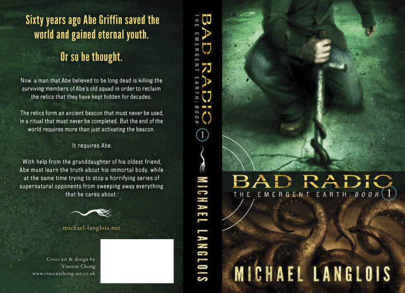I just received a proof of the art for the print version of Bad Radio, and I don’t mind saying that I think it’s the bees knees. I really like the layout and color choices for the back copy, and how Vinny integrated the chapter art. The whole thing just seems to flow without seeming fussy or too busy, which is harder to do than it sounds.
