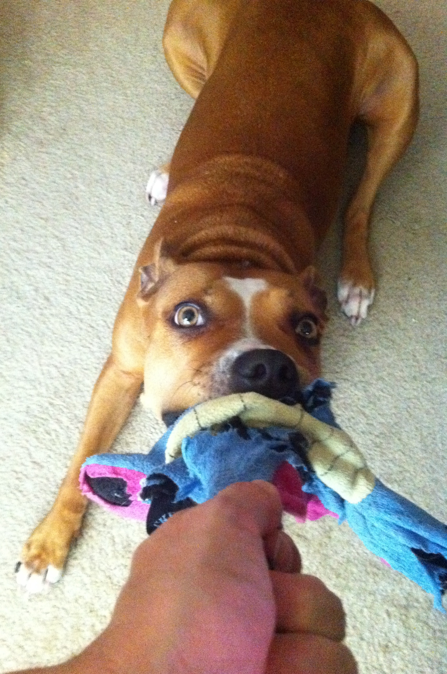 Damn you cute dog! Stop staring at me with a toy hanging out of your mouth!