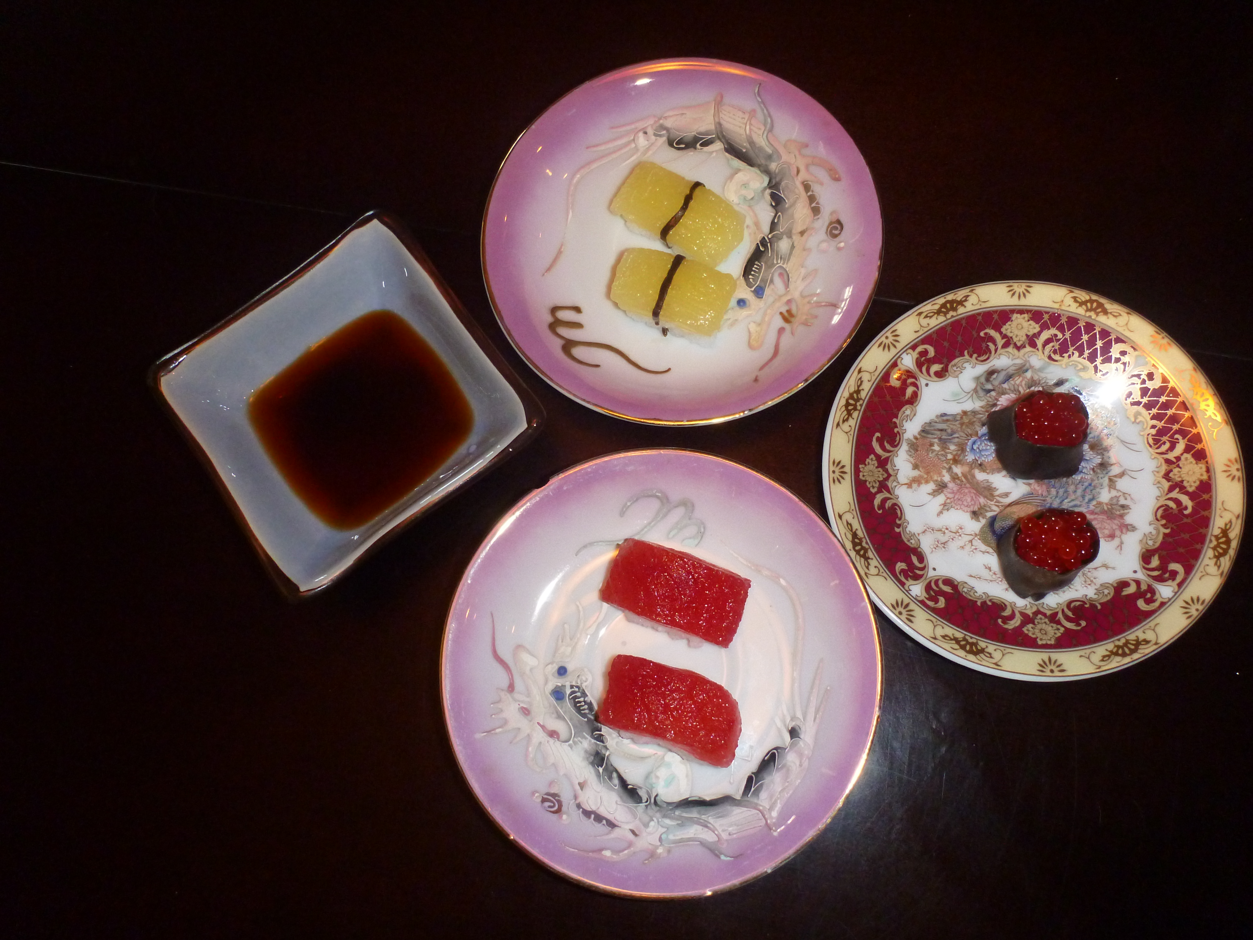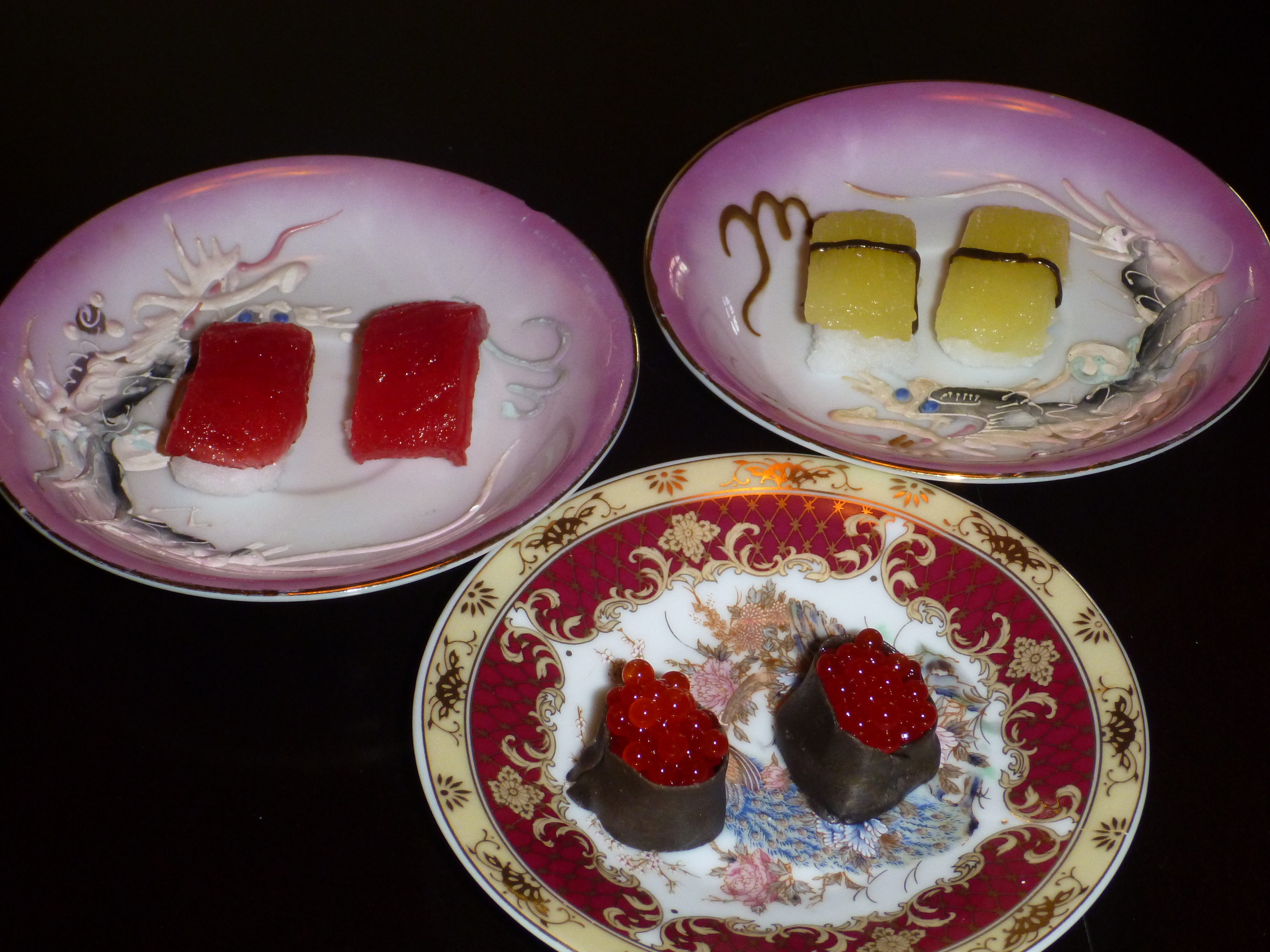 One other cool thing, the salmon roe are actually still liquid in the center. You drop the candy liquid into a gelatin catalyst, so that only a skin of gummi candy is formed around the drop. That way, when you bite into it,the ‘roe’ actually burst like the real thing. So very clever.