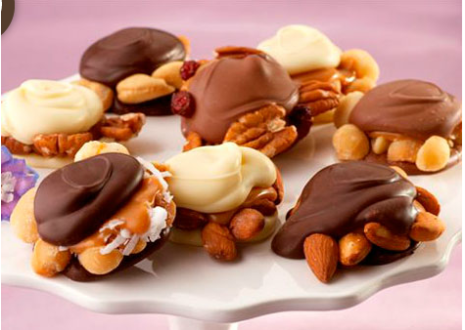 Of course, that’s not the whole story. The real reason that the nuts are exposed (ahem) is that it’s the only way to let them retain their toothsome crunch, not too crisp, not too soft. A great pecan or almond or cashew is a complex mix of texture and sweet and salt, and should not be allowed to smother inside the candy.