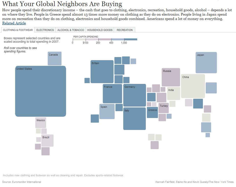 Clicking on the image will take you to the flash app created by the New York Times. What it shows is the per capita consumer spending habits by nation, divided by country. The bigger the block, the bigger the spend. Click through each tab, and you’ll notice that we Americans always have the biggest block. We spend more, per person, than anyone else on everything.